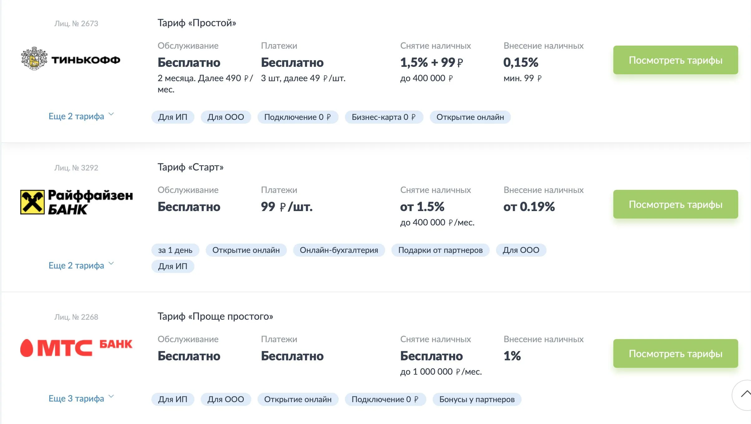 Если вы задумаете начать собственный бизнес, вам обязательно понадобится расчетный счет в банке. Теперь его можно подобрать у нас. Все основные условия РКО указаны в тизере, поэтому предложения разных банков очень удобно сравнивать по стоимости обслуживания и комиссиям. Также компактно указаны дополнительные характеристики: бонусы, скидки, открытие онлайн и прочее.