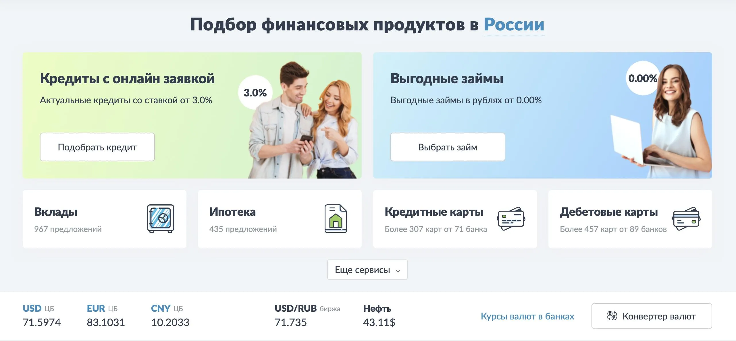 Если вы еще не были на нашей «главной», то вам стоит взглянуть. Это настоящий калейдоскоп по финансам. В один клик можно перейти к подбору кредита или займа, а также присмотреться к лучшим банковским продуктам за месяц. Еще чуть ниже размещены последние новости экономики и отзывы о банках. В общем, теперь на «главной» есть все самое нужное, что вам нужно знать о финансах.