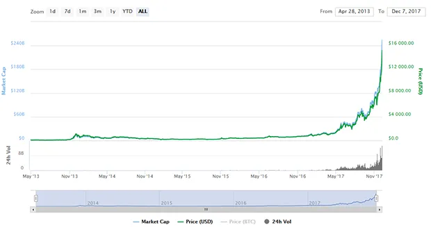Рост курса биткоина набирает стремительные обороты, его стоимость перешла планку в 15000$. На 11:04 7 декабря курс биткоина составляет 15518,7$. Максимальный курс Bitcoin представлен на бирже Coinmarketcap.