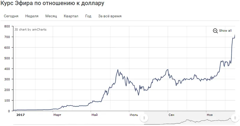 Вторые по значимости цифровые деньги Ethereum пока не претендуют на подобное признание мирового капитала, однако в последнее время криптовалюта Виталика Бутерина практически еженедельно преодолевала собственные исторчиеские максимумы. И теперь эфир торгуется по средневзвешенному курсу в 710 долларов.