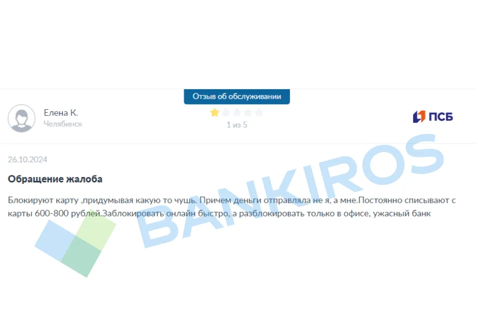 - Читательница Елена К. сообщила о блокировках карты без объяснения причины Промсвязьбанком. При этом для разблокировки клиентке заявили, что необходимо прийти в отделение банка.