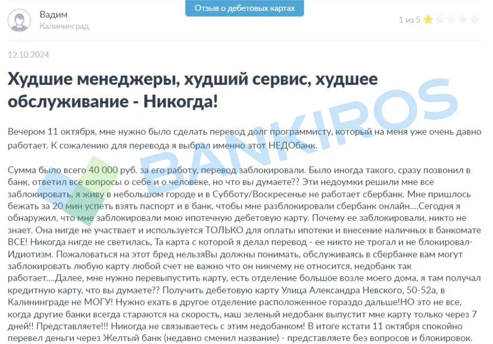 - Проблемы возникли и у клиентов крупнейшего российского банка. Как рассказал Вадим из Калининграда, Сбер заблокировал ему доступ к онлайн-банку из-за перевода на 40 тысяч рублей, из-за чего клиенту экстренно пришлось бежать в ближайший офис, чтобы получить доступ к деньгам.