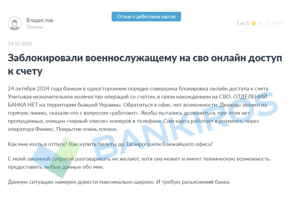 - Пожаловался на блокировку счетов и участник СВО. По его словам, ВТБ не только ограничил доступ к деньгам военнослужащему, но и обязал его лично прийти в отделение кредитной организации для решения проблемы. И такие отзывы о данной кредитной организации опубликовали клиенты из разных городов.