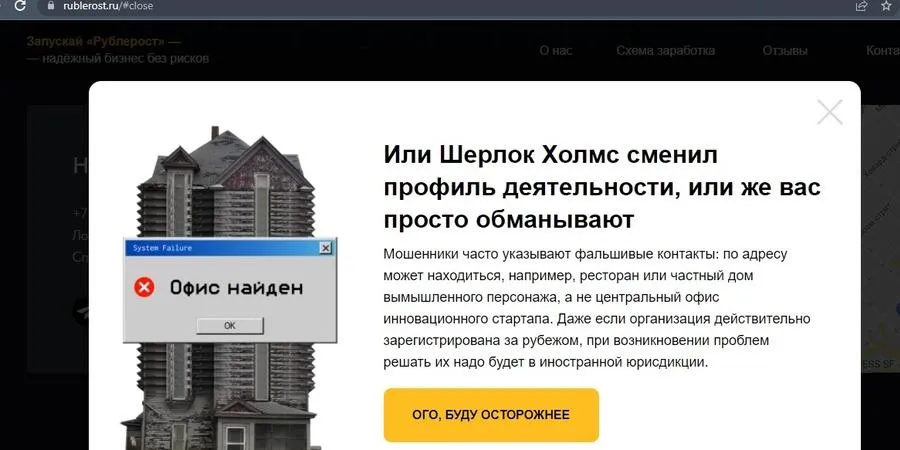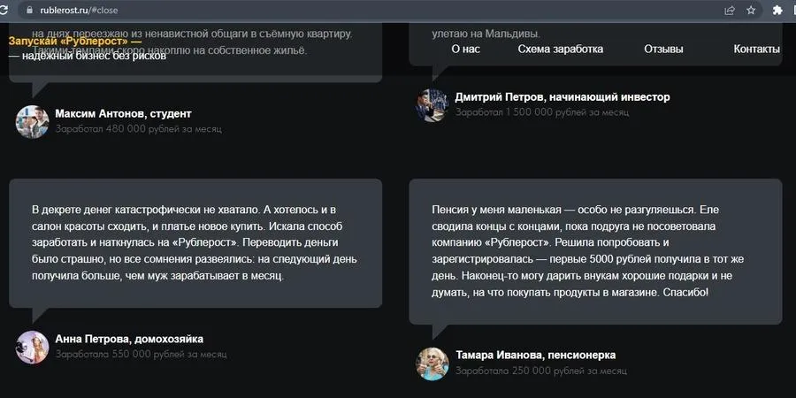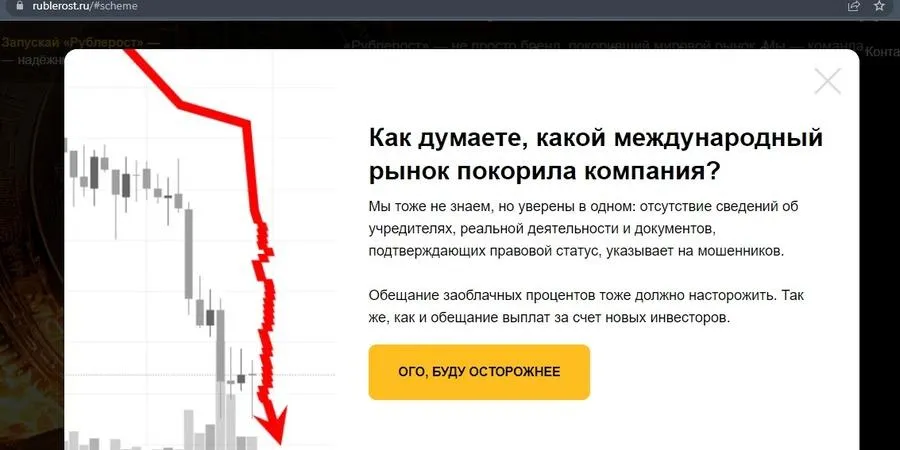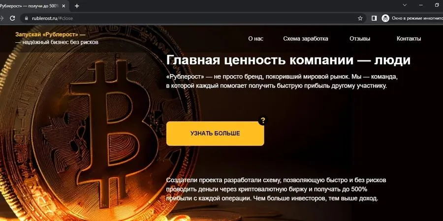 На сайте «Рублероста» есть предупреждение, что это образовательная платформа, так как на первый взгляд его сложно отличить от недобросовестных псевдобизнесменов. Там сообщается о схеме, которая якобы позволит быстро и без рисков переводить деньги в криптовалюту. Пользователю обещают прибыль 500% уже завтра и предлагают присоединиться к «перспективному проекту». Также прикреплен таймер, сколько времени осталось, чтобы успеть заработать.