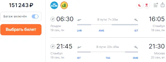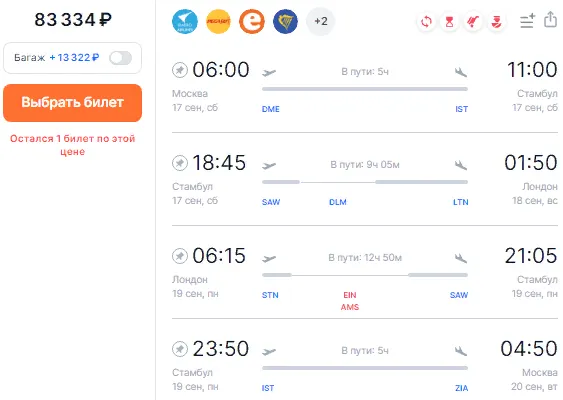 - обратный перелет 19 сентября в 6:30 мск из Лондона через Стамбул с прибытием в Москву 20 сентября в 20:30 (151 243 рубля).