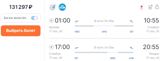 - перелет бизнес-классом (131 297 рублей) с прибытием в Лондон 17 сентября в 20:55 мск;