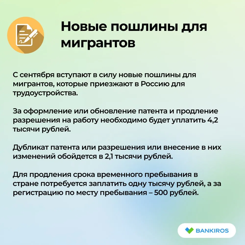 С сентября вступают в силу новые пошлины для мигрантов, которые приезжают в Россию для трудоустройства. За оформление или обновление патента и продление разрешения на работу необходимо будет уплатить 4,2 тысячи рублей.