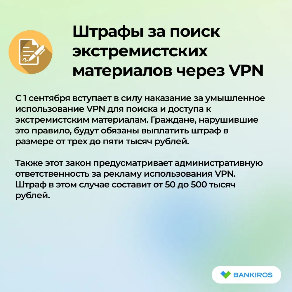С 1 сентября вступает в силу наказание за умышленное использование VPN для поиска и доступа к экстремистским материалам. Граждане, нарушившие это правило, будут обязаны выплатить штраф в размере от трех до пяти тысяч рублей.