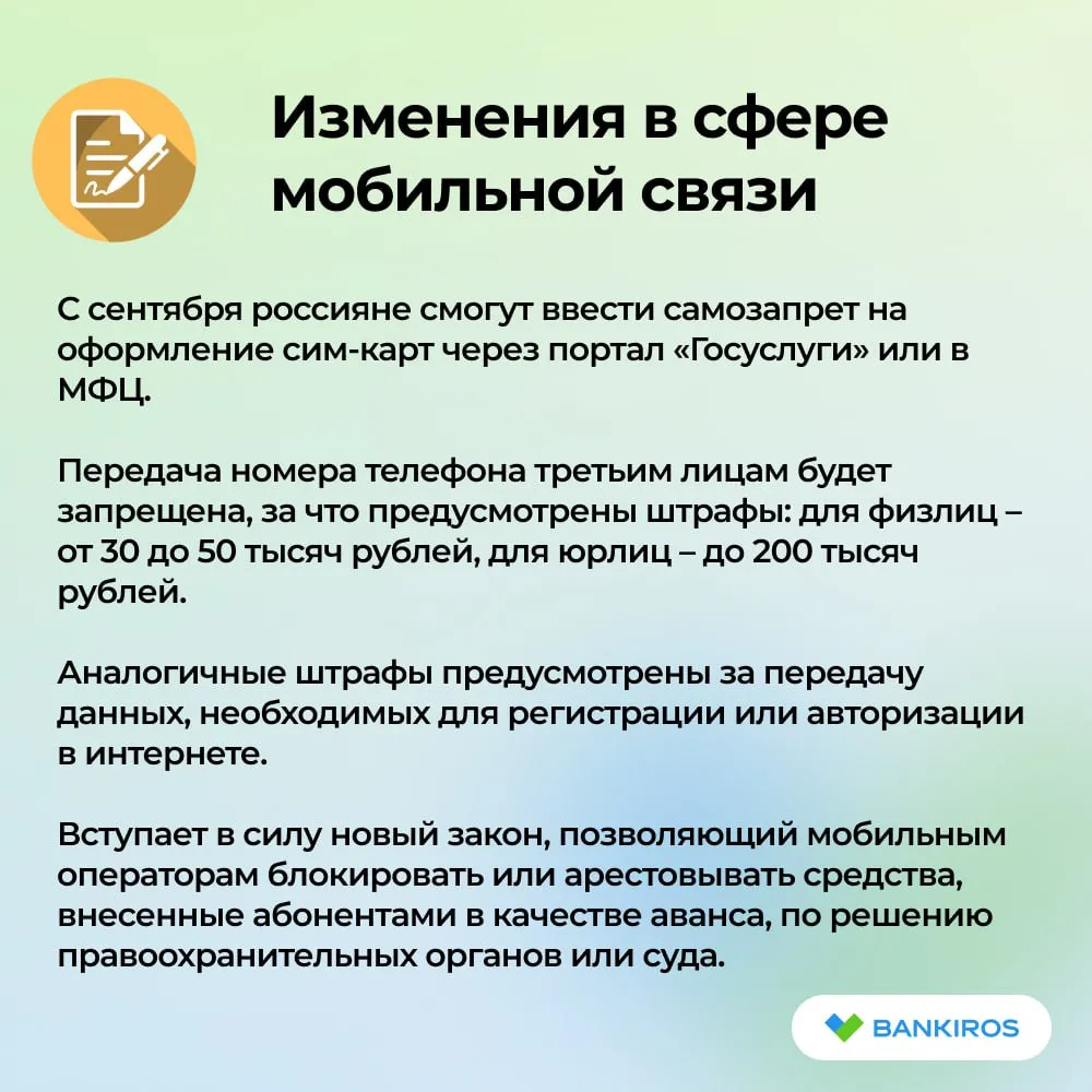 - Вступает запрет на навязывание дополнительных услуг и товаров без письменного согласия клиента, а также новые правила в в сфере мобильной связи: самозапрет на оформление SIM-карт, штрафы за передачу номеров и блокировка авансовых средств по решению суда;