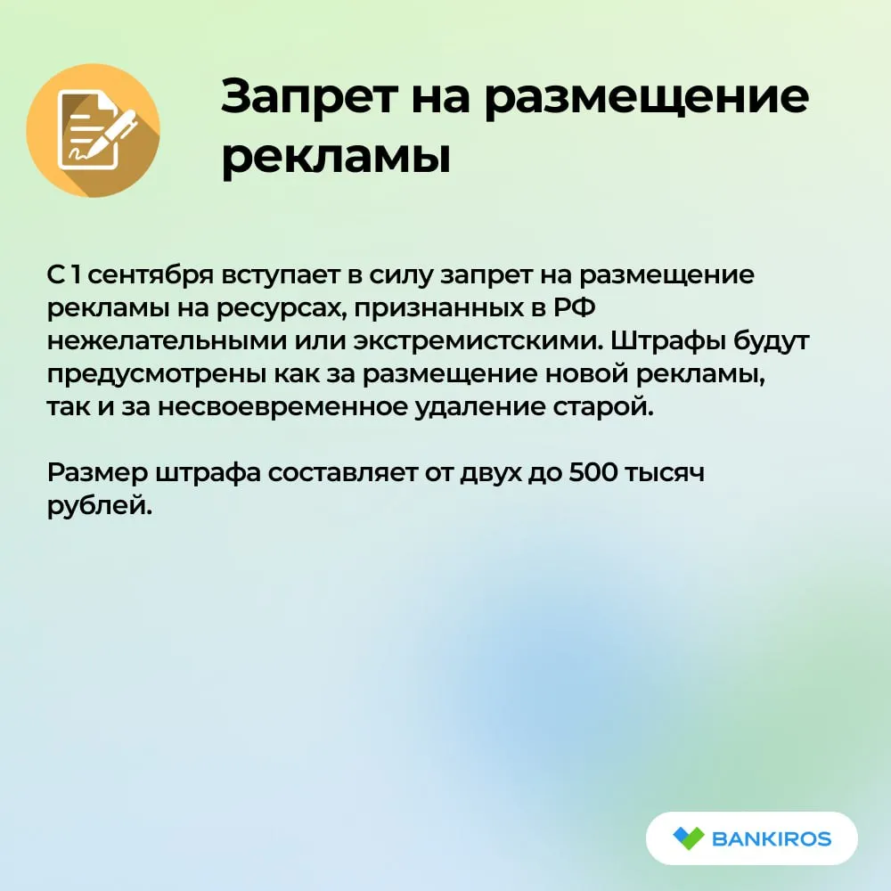 С 1 сентября вступает в силу запрет на размещение рекламы на ресурсах, признанных в РФ нежелательными или экстремистскими. Штрафы будут предусмотрены как за размещение новой рекламы, так и за несвоевременное удаление старой.