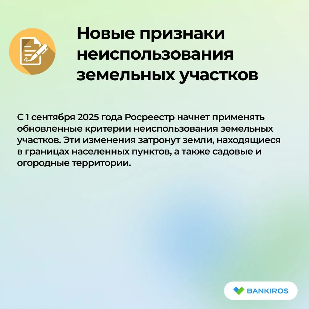 С 1 сентября 2025 года Росреестр начнет применять обновленные критерии неиспользования земельных участков. Эти изменения затронут земли, находящиеся в границах населенных пунктов, а также садовые и огородные территории. Что входит в список признаков неиспользования земли, подробно рассказали здесь.