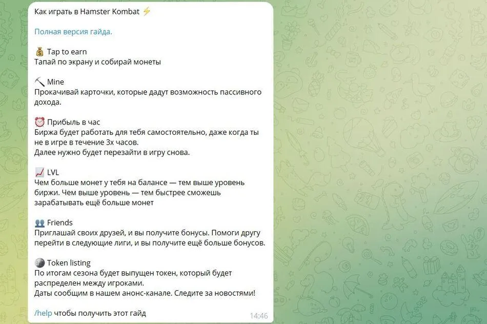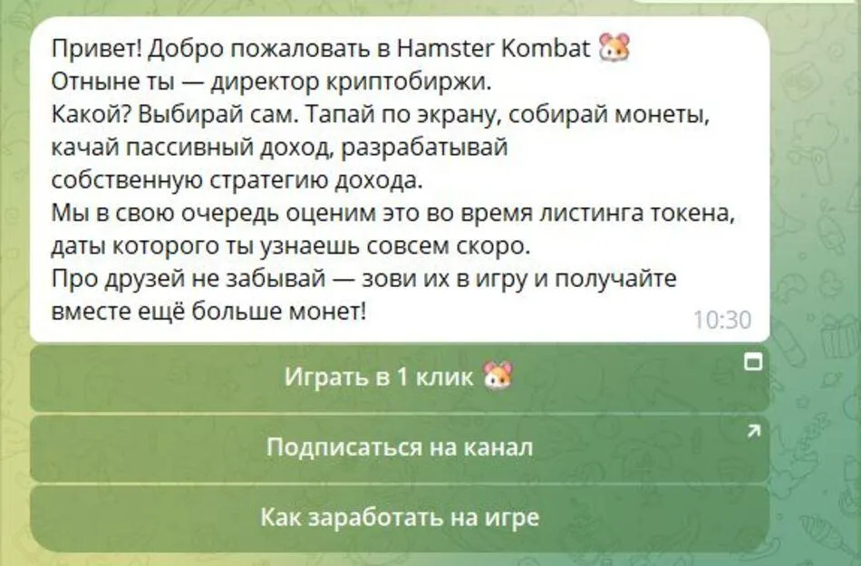 Хомяк – персонаж телеграм-бота Hamster Kombat (Хамстер Комбат). Примечательно, что сами разработчики называют это приложение «игрой», начиная свой гайд словами «Как играть в Hamster Kombat». Вот как выглядит инструкция для новичков. По факту, пользователям сообщают: мы придумали реальный шанс заработать. Для этого тебе не нужно учиться, что-то знать и делать.