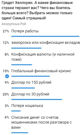 Какие финансовые страхи больше всего терзают сегодня россиян на самом деле? В преддверии Хэллоуина телеграм-канал Bankiros.ru провел опрос среди своих пользователей. На момент написания статьи в нем приняли участие более 730 россиян, однако люди продолжают голосовать.