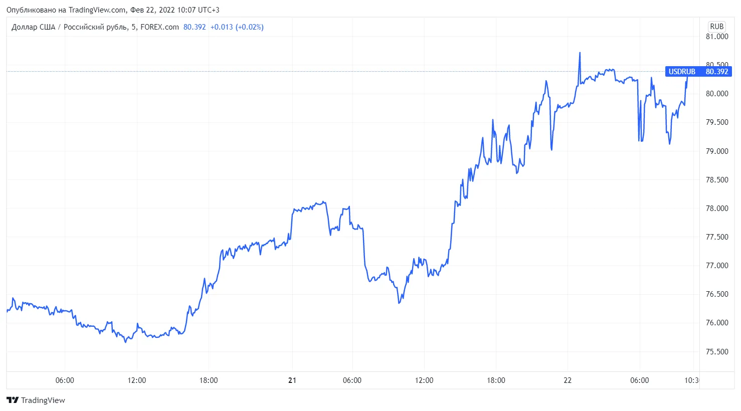 Отметим, сегодня, 22 февраля, официальный курс валют Центробанка составляет: доллар – 76,76 рублля, евро – 87,33 рубля. Текущие курсы валют на бирже: доллар – 80,39 рубля, евро – 90,85 рубля.