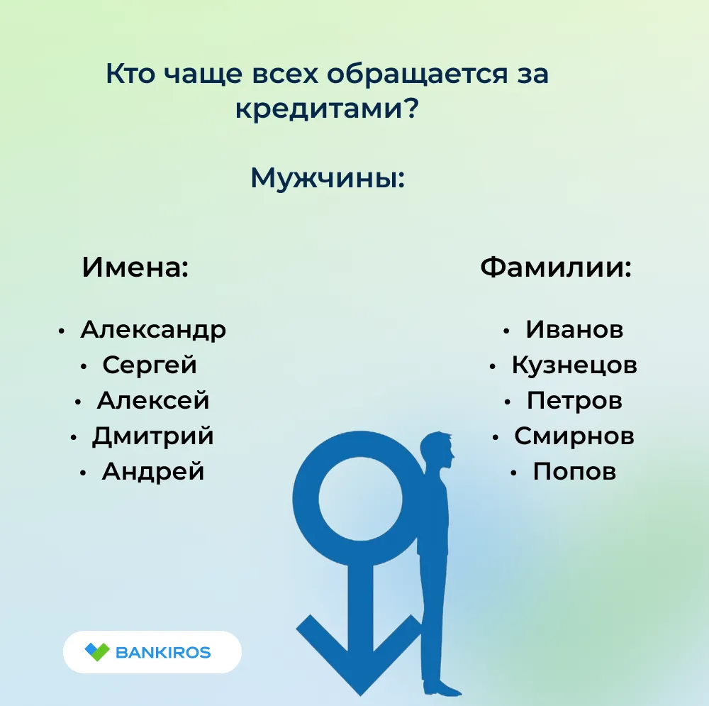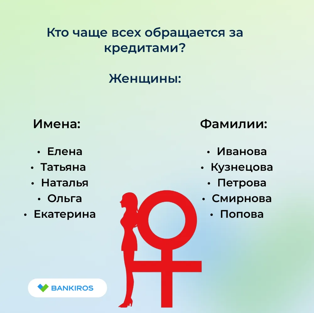 - Согласно статистике за 2023 год, ФИО тех, кто чаще всего обращается за кредитами, не изменилось в 2024 году.