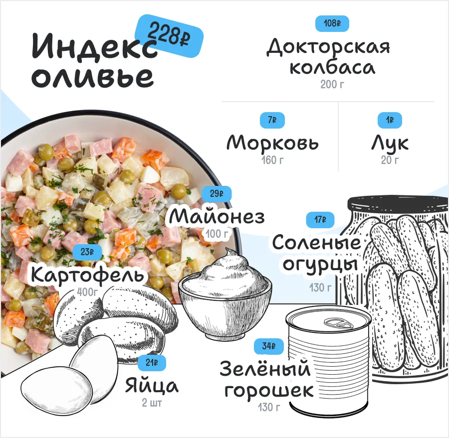 Исходя из цен в мониторинге Росстата, приготовить оливье в 2024 году обойдется в 228 рублей. Взята стоимость за октябрь. Год назад приготовление стоило 231 рубль, исходя из цен за декабрь 2023 года. Стоимость почти не изменилась.