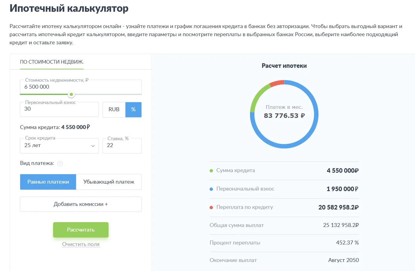 Если сегодня купить квартиру за 6,5 млн рублей в ипотеку на 25 лет по ставке 22% с первоначальным взносом в 30%, то нужно будет оформить кредит на 4,55 млн рублей (это средний срок по индивидуальному жилищному кредитованию в июне 2025 года, согласно данным ЦБ РФ) и ежемесячно платить почти по 84 тысячи. Переплата по кредиту составит 452% или 20,6 млн рублей.