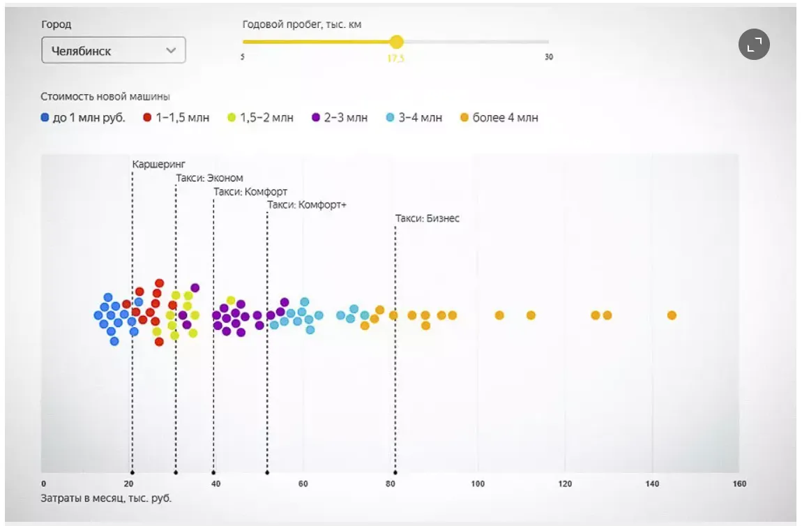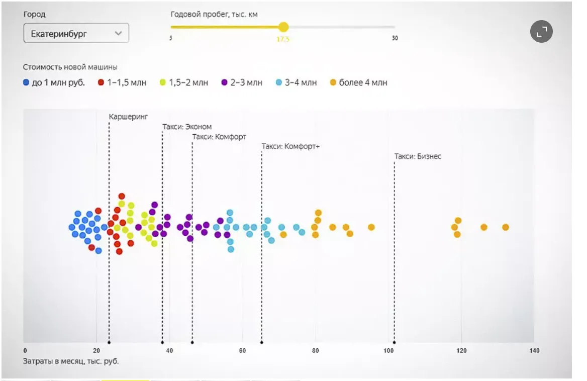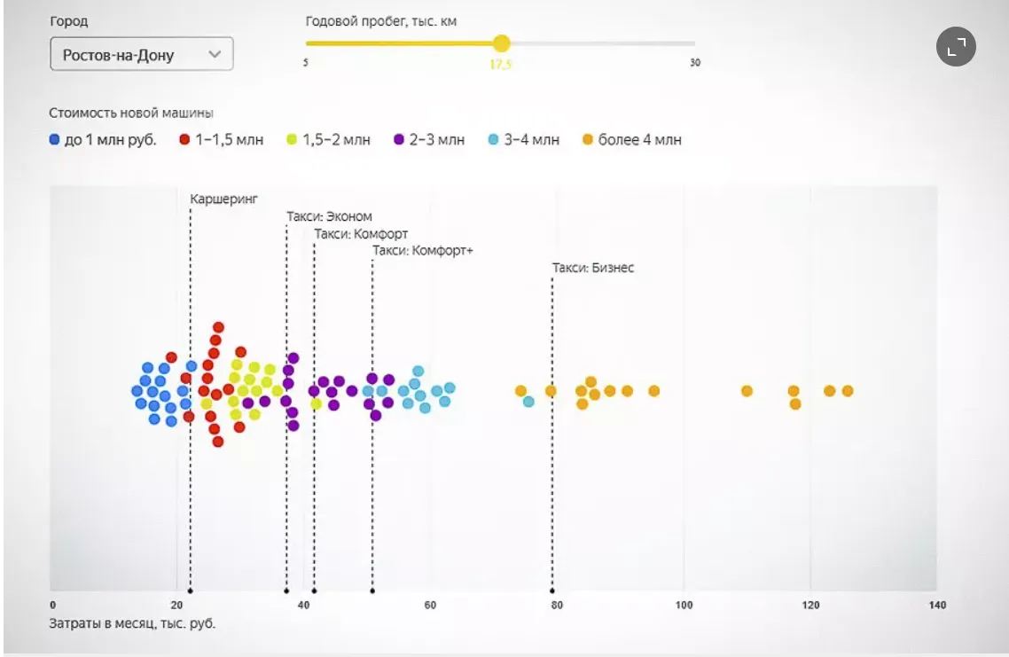Расходы на каршеринг в Москве сопоставимы с расходами на автомобиль стоимостью до двух млн рублей, их обслуживание обойдется около 31 тысячи рублей в месяц, на на автомобили до трех млн придется потратить около 35 тысяч рублей в месяц. При этом они будут дешевле такси «Эконом». Затраты на поездки «Комфортом» сопоставимы с затратами на автомобили стоимостью три-четыре млн. В регионах ситуация похожая. Для некоторых регионов сумма в 30 тысяч рублей равна месячной зарплате, поэтому для них выгоднее будет только общественный транспорт.