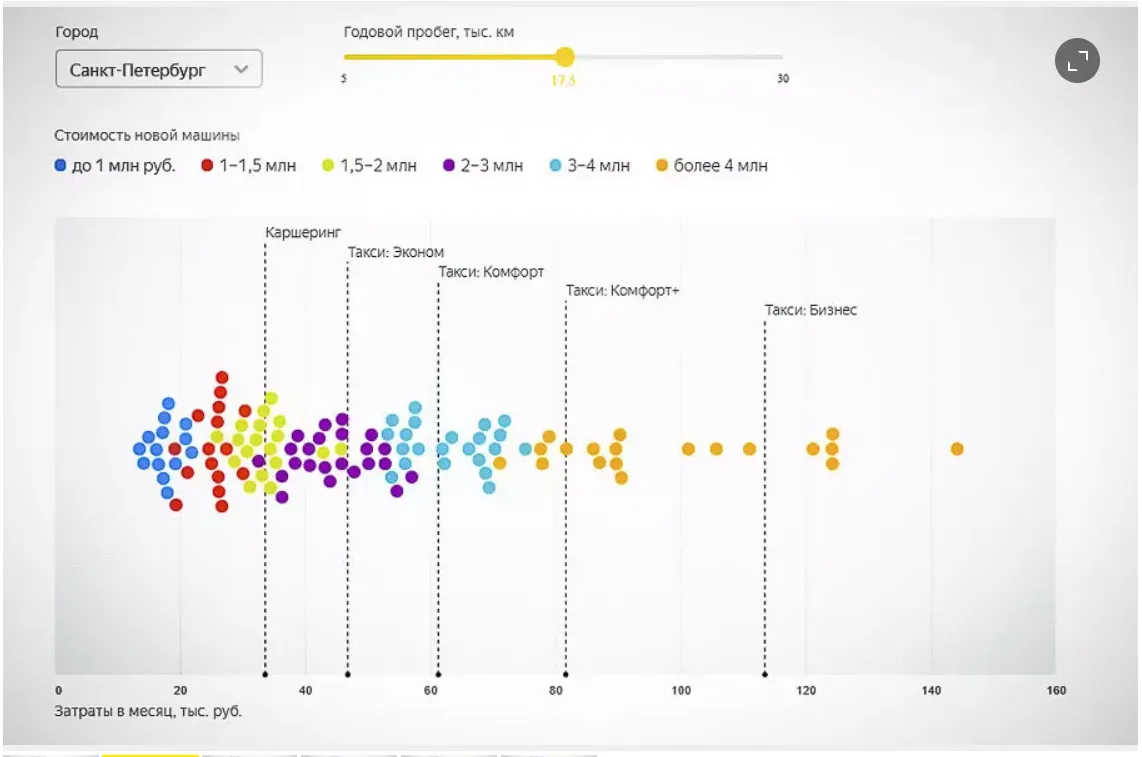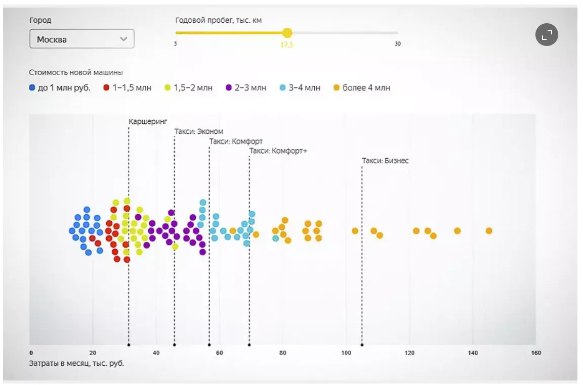 В столице выгоднее использовать машину стоимостью до миллиона рублей, чем заказывать такси или каршеринг, советуют в «Яндекс». Если автомобиль стоит от двух до трех миллионов рублей, то каршеринг все также невыгоден, зато такси эконом-класса будет дешевле. Однако с такси класса «Комфорт» сэкономить уже получится.