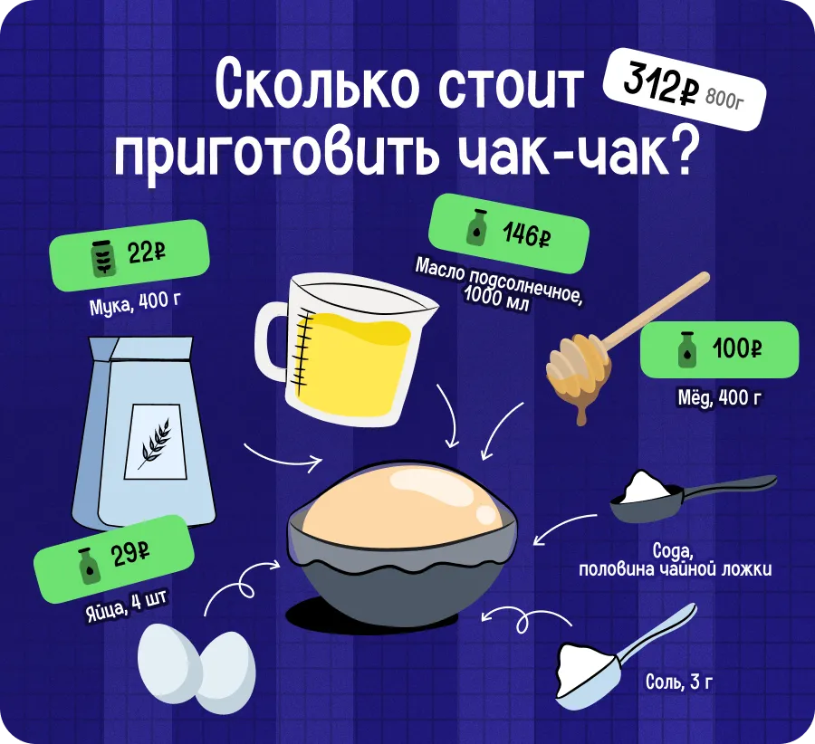 Приготовление чак-чака в России обойдется в 312 рублей. Дороже всего обойдется литр подсолнечного масла (146 рублей) и 300 граммов меда (100 рублей).