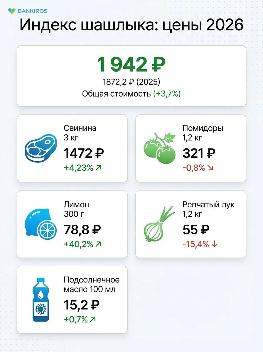 Что касается общей стоимости, то набор стал дороже на 3,7%. В 2025 году можно было уложиться в 1872,2 рубля, сейчас купить продукты для шашлыка стоит 1942 рубля.