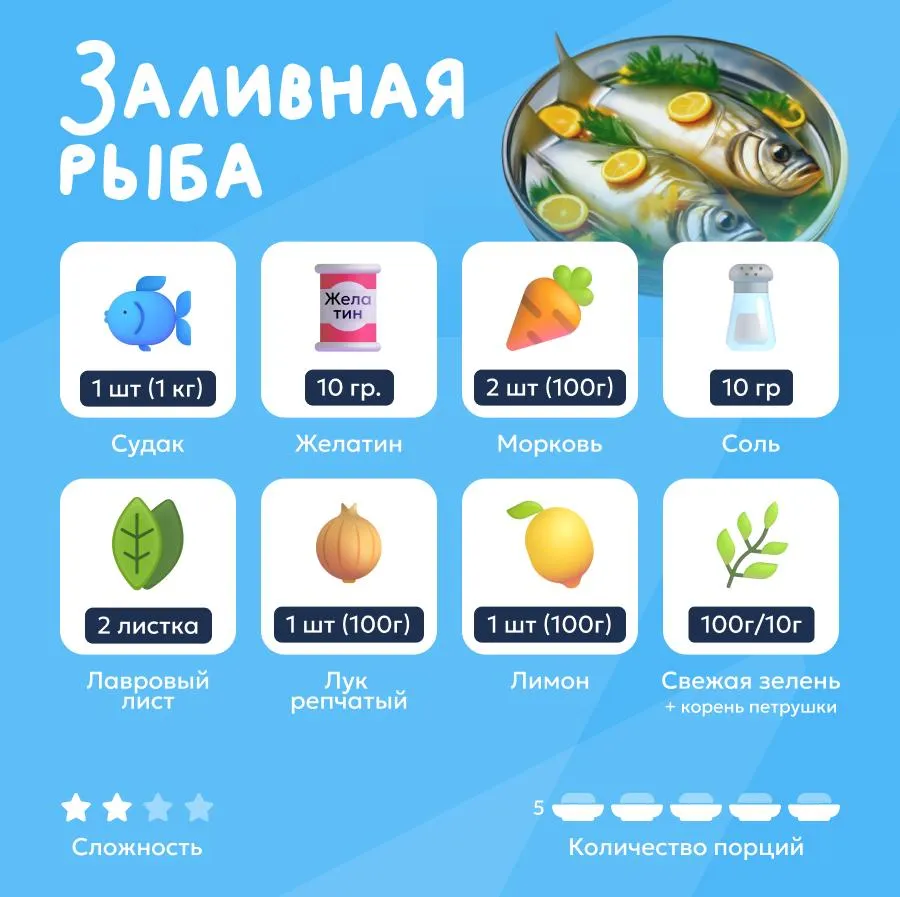 Итак, на пять порций заливной рыбы, согласно рецепту «Книги о вкусной и здоровой пище», потребуется: