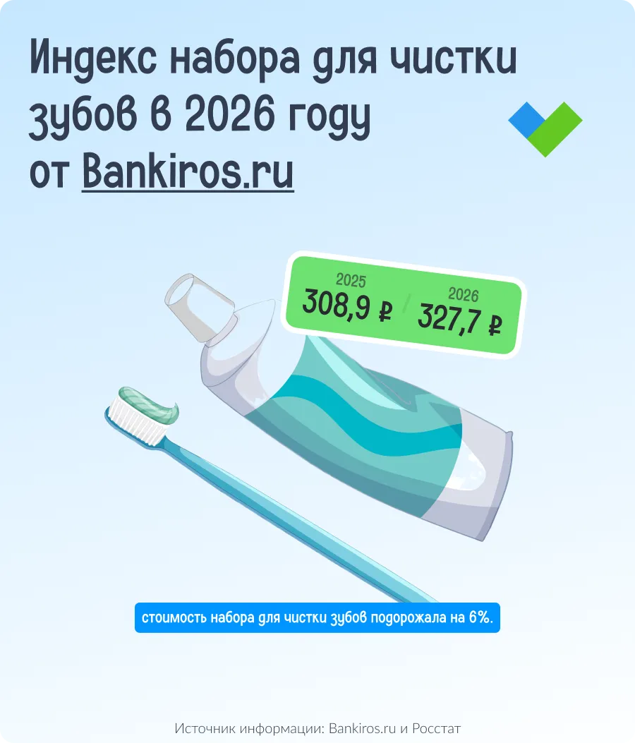 - в феврале 2025 года стоимость зубной щетки и пасты была 308,9 рубля, в 2026 году стоимость составляет 327,7 рубля;