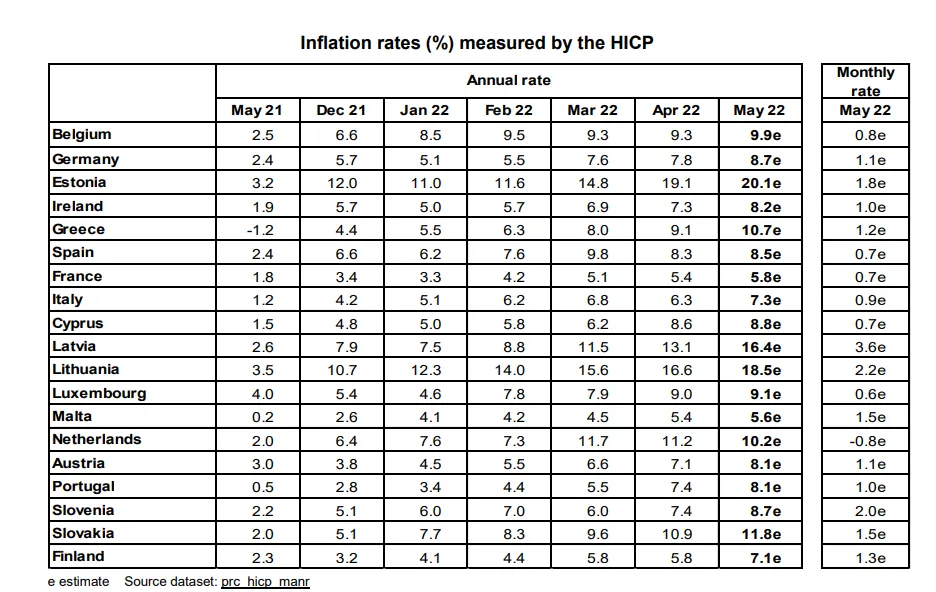 Самые низкие темпы инфляции в мае зафиксированы во Франции – 5,8%, на Мальте – 5,6%, в Финляндии – 7,1% и в Италии – 7,3%. Напомним, что в зону использования евро сейчас входят 19 государств-членов Европейского союза.
