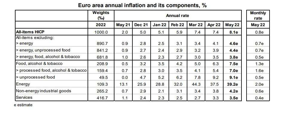 По предварительной оценке Евростата, инфляция в еврозоне в мае составила в среднем 8,1%. Это значительный рост по сравнению с мартом и апрелем этого года. Тогда инфляция держалась на отметке в 7,4%.