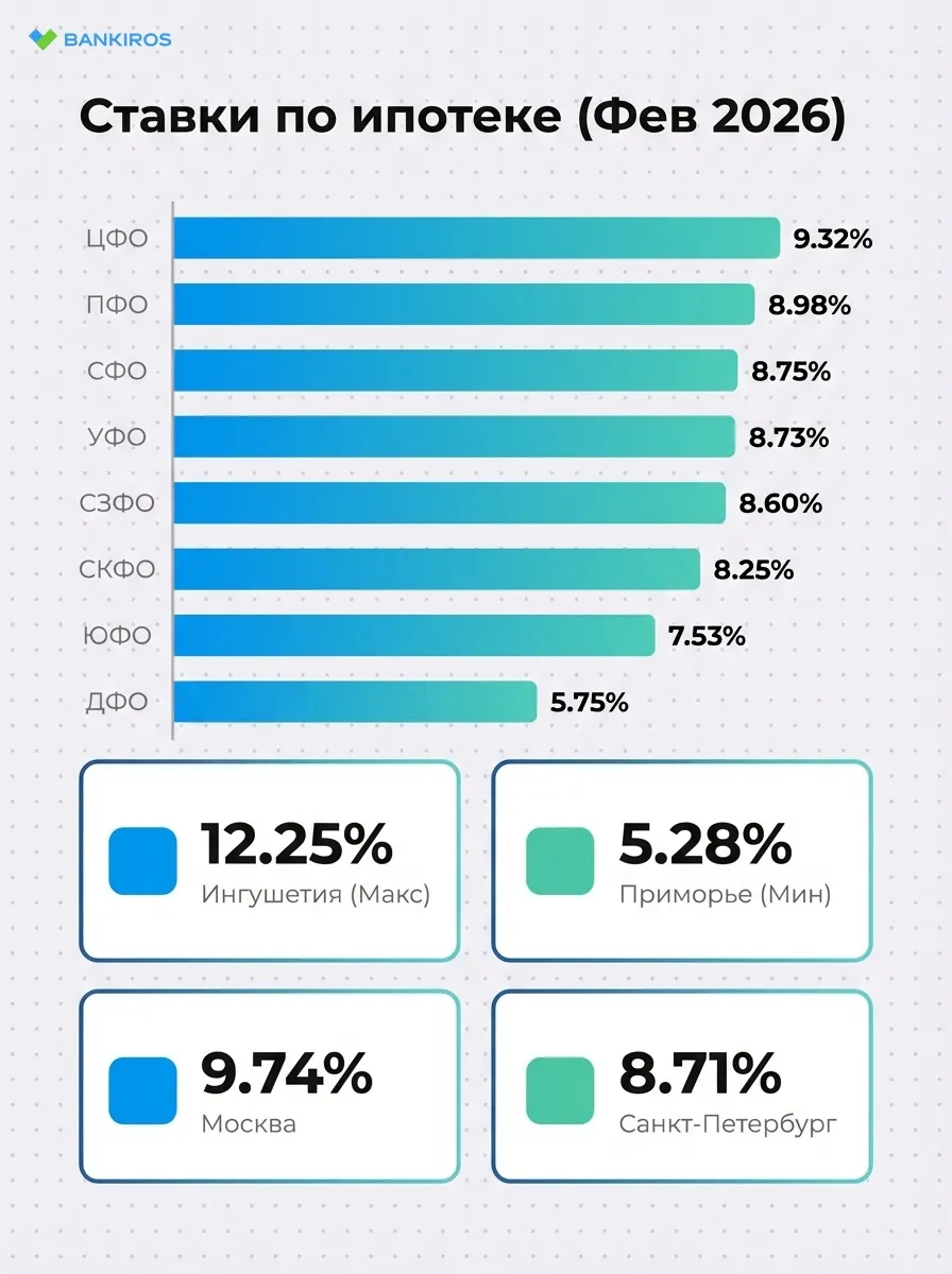 В начале 2026 года на ипотечном рынке России стала заметна значительная региональная разница. По данным Банка России за февраль, средние ставки в большинстве федеральных округов выросли по сравнению с прошлым годом. Цены на ипотеку растут неравномерно. В некоторых регионах кредиты стали значительно дороже, а в других сохраняются льготные условия.