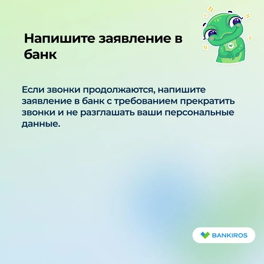- Напишите заявление в банк. Если звонки продолжаются, напишите заявление в банк с требованием прекратить звонки и не разглашать ваши персональные данные.