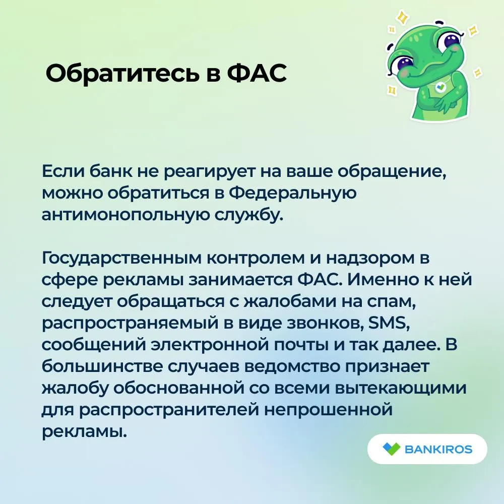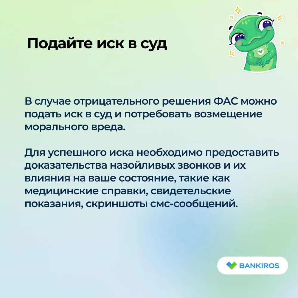 - Если звонки продолжаются, действуйте в следующем порядке: напишите заявление в банк, обратитесь в ФАС или Роспотребнадзор и в крайнем случае подайте иск в суд.