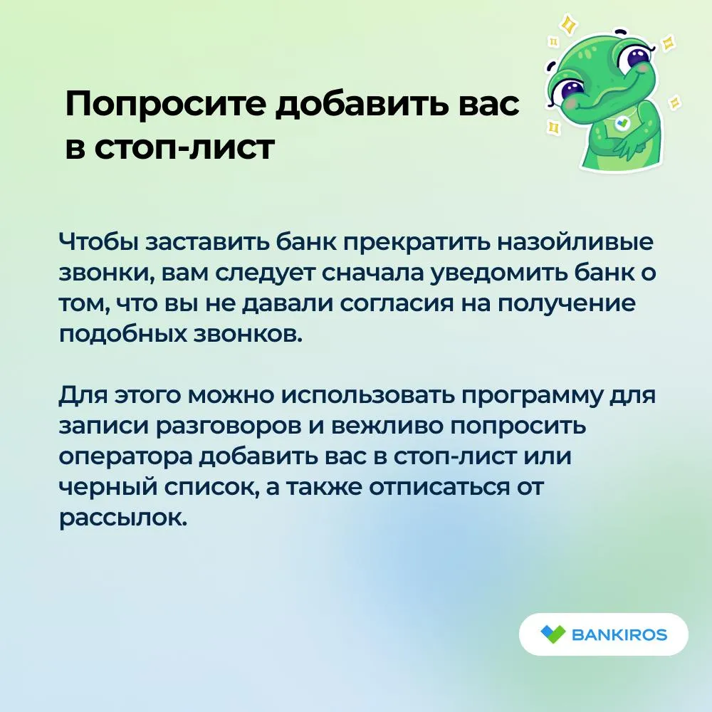 - Попросите добавить вас в стоп-лист. Чтобы заставить банк прекратить назойливые звонки, вам следует сначала уведомить банк о том, что вы не давали согласия на получение подобных звонков.