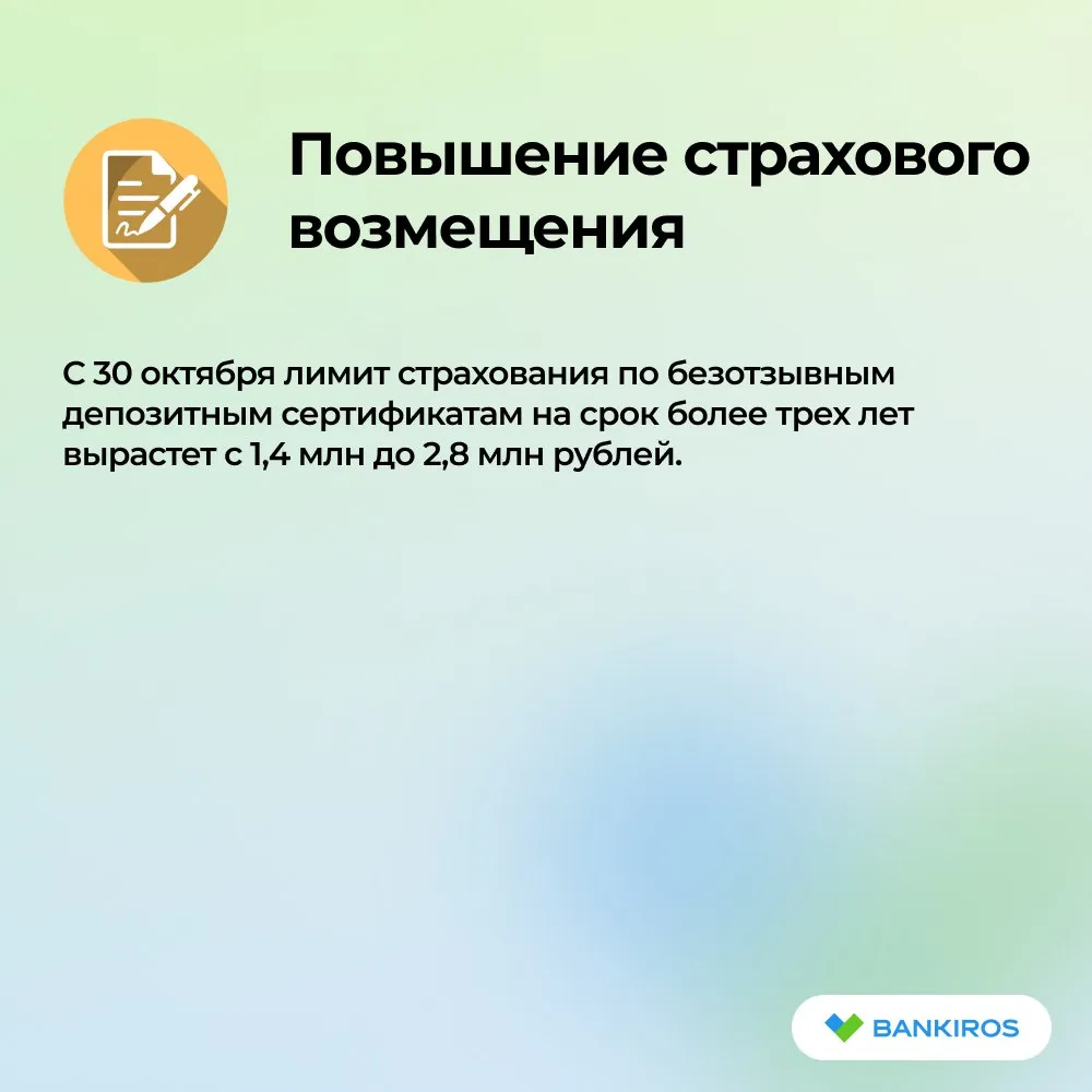- Страховое возмещение по безотзывным депозитным сертификатам сроком свыше трех лет увеличится до 2,8 млн рублей;