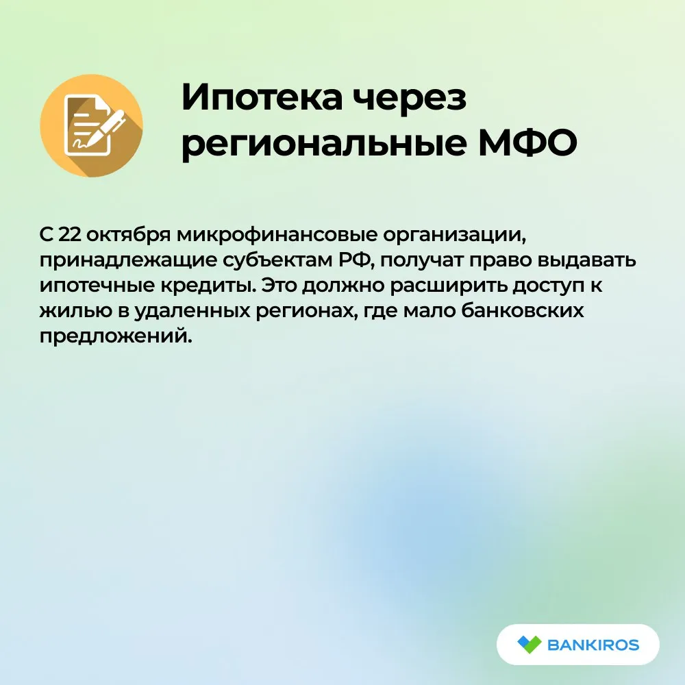 С 22 октября микрофинансовые организации, принадлежащие субъектам РФ, получат право выдавать ипотечные кредиты. Это должно расширить доступ к жилью в удаленных регионах, где мало банковских предложений.