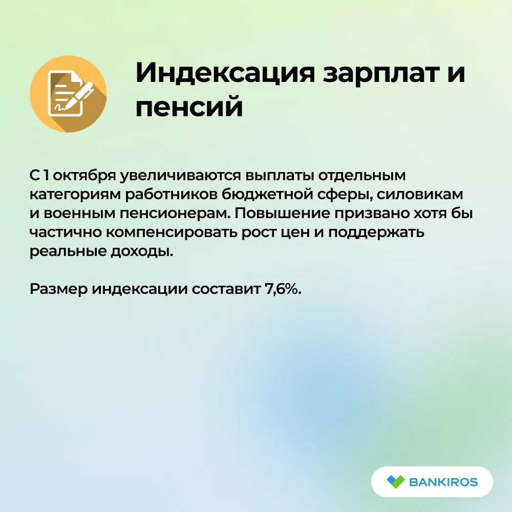 - С 1 октября 2025 года зарплаты работников бюджетной сферы, силовиков, а также пенсии военных пенсионеров проиндексируют на 7,6%;
