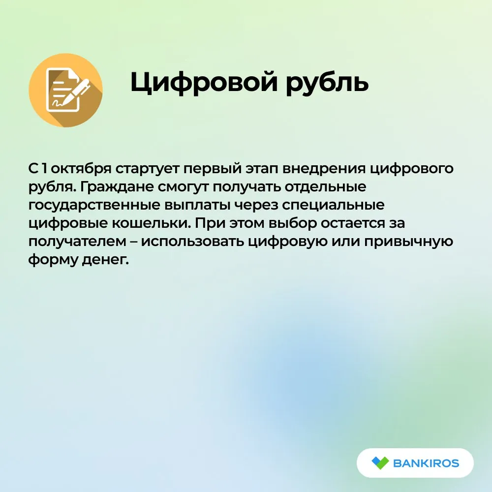 - С 1 октября запускается первый этап внедрения цифрового рубля – часть госвыплат можно будет получать в цифровых кошельках;