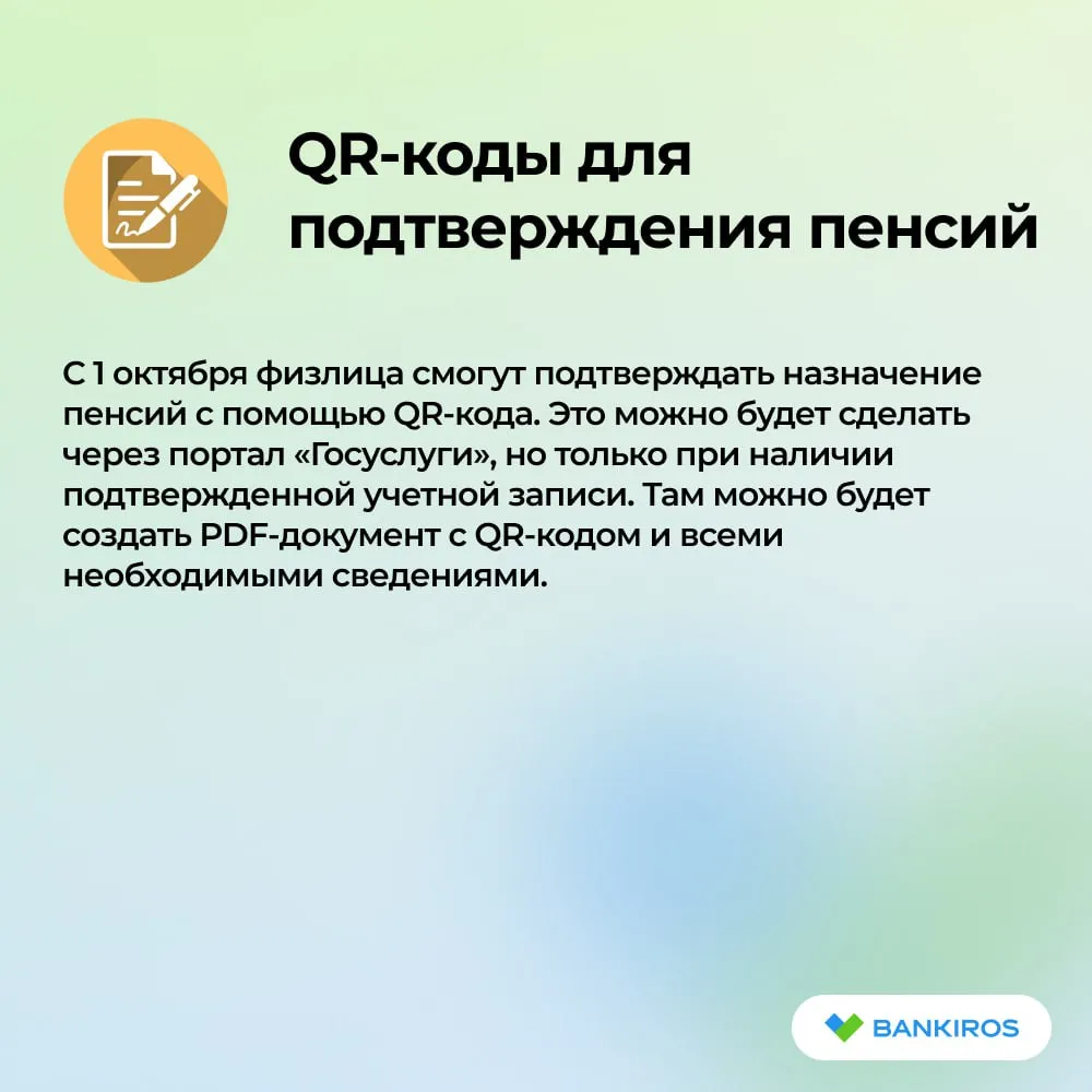 С 1 октября физлица смогут подтверждать назначение пенсий с помощью QR-кода. Это можно будет сделать через портал «Госуслуги», но только при наличии подтвержденной учетной записи. Там можно будет создать PDF-документ с QR-кодом и всеми необходимыми сведениями.