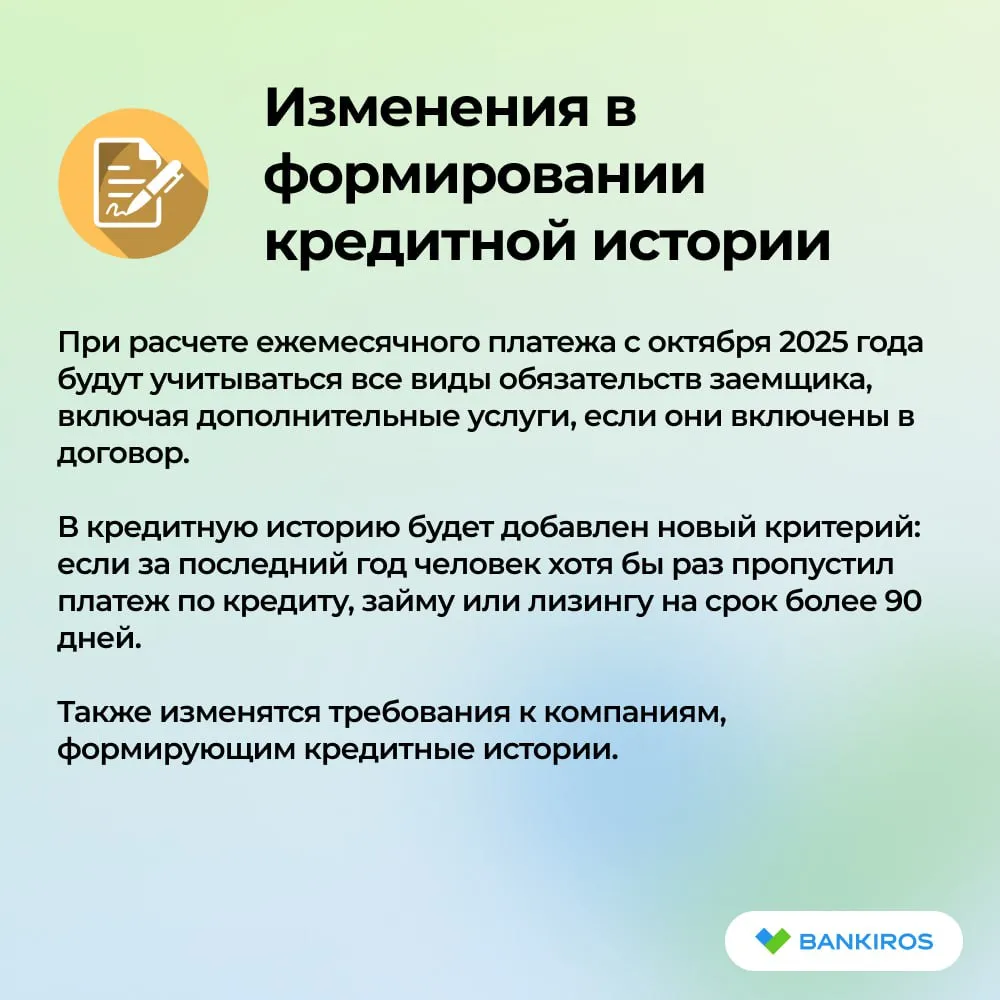 В кредитную историю будет добавлен новый критерий: если за последний год человек хотя бы раз пропустил платеж по кредиту, займу или лизингу на срок более 90 дней. Также изменятся требования к компаниям, формирующим кредитные истории.