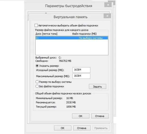 В открывшемся окне нажмите «Изменить» в разделе «Виртуальная память». Затем уберите галочку с пункта «Автоматически выбирать объем файла подкачки». Выберите пункт «Указать размер» и введите значение «16384» в поля «Исходный размер» и «Максимальный размер», а после – подтвердите свои настройки, кликнув «ОК». Должна получится такая картина.