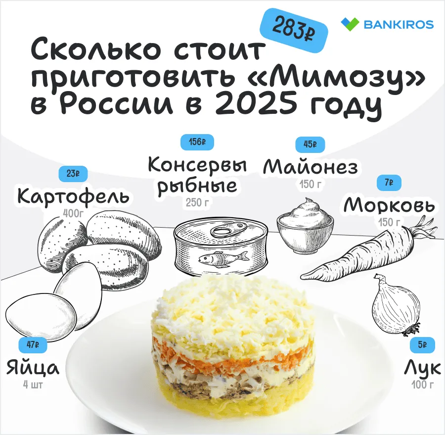Таким образом, приготовить «Мимозу» в России в 2025 году стоит 283 рубля, что на 28 рублей или на 10,9% дороже, чем годом ранее. В 2024 году цена была 255 рублей.