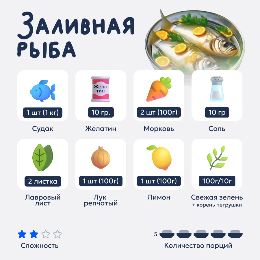 Для анализа мы использовали проверенный временем рецепт из «Книги о вкусной и здоровой пище», выпущенной в 1952 году. В основе рецепта – свежий судак, коренья, зелень и желе на основе бульона.