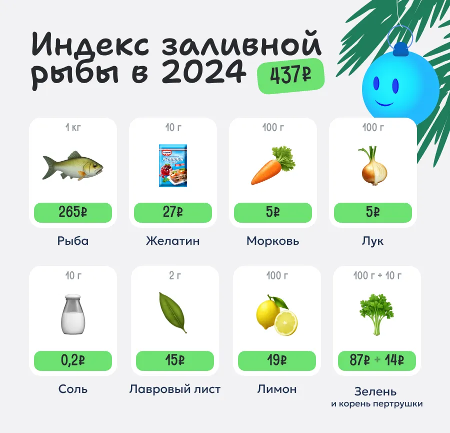 - Цены выросли незначительно. Стоимость заливной рыбы в 2024 году составляет 437 рублей, что лишь на 2 рубля больше, чем год назад;