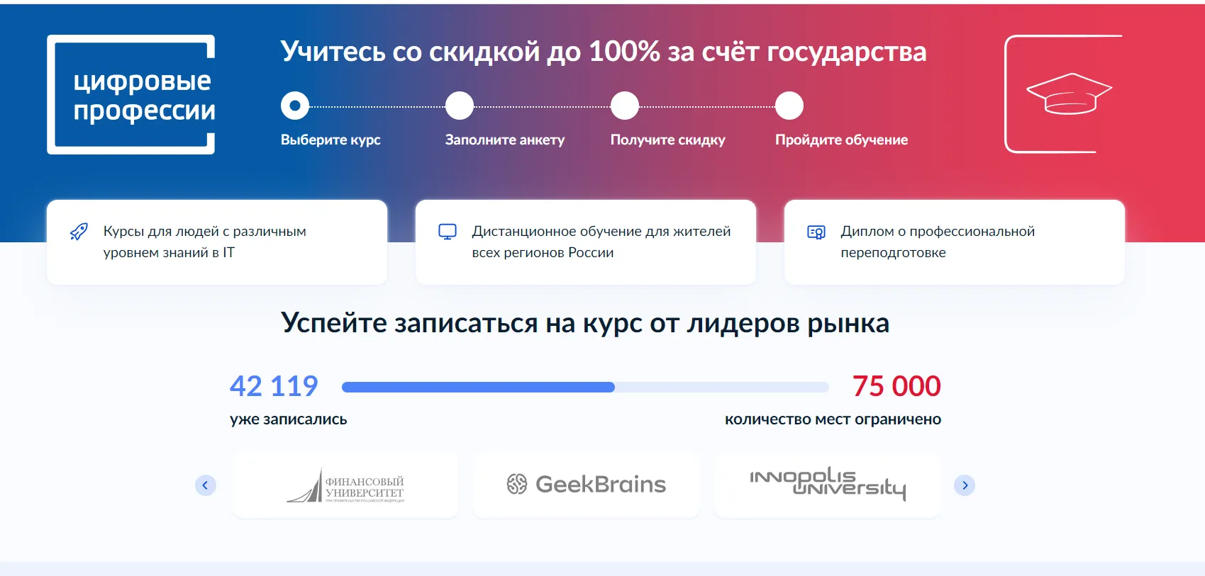 Обучение цифровым профессиям со скидками предлагаю государственные и коммерческие компании, в том числе Российский экономический университет им. Плеханова, университет ИТМО, Яндекс Практикум, «Нетология», GeekBrains, «Сбер-университет» и другие.
