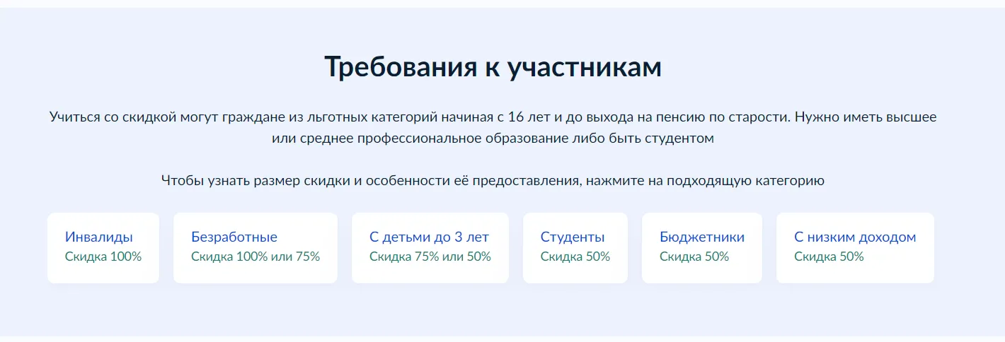 Пройти обучение цифровой профессии со скидкой могут граждане старше 16 лет с образованием не ниже средне специального, относящиеся к одной из льготных категорий: