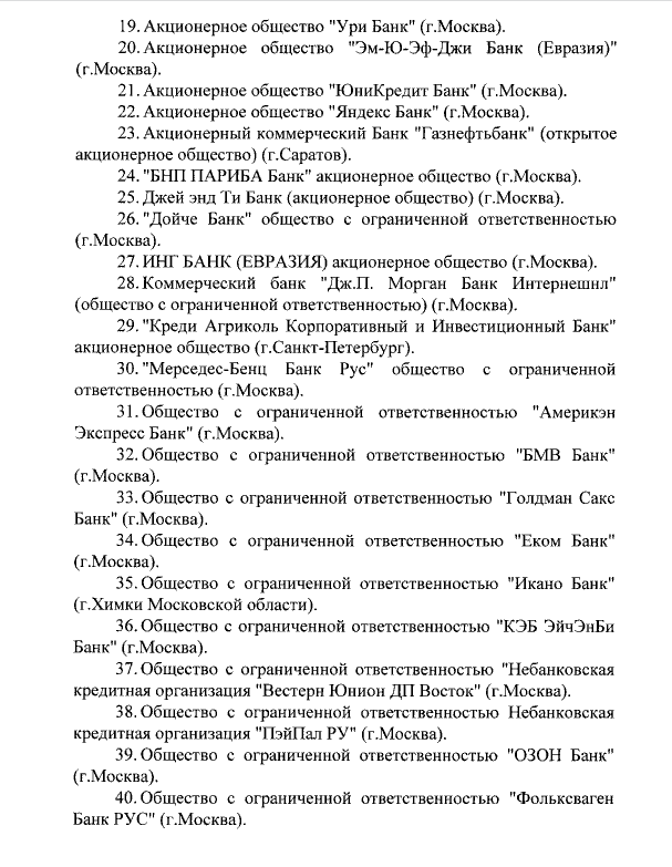 Среди из наверняка известных большинству россиян банков в перечень входят Райффайзенбанк, Ситибанк, ОТП Банк, «КОММЕРЦБАНК (ЕВРАЗИЯ)», ЮниКредит Банк, Дойче Банк и еще несколько десятков банков, которые вы можете увидеть на скринах ниже.
