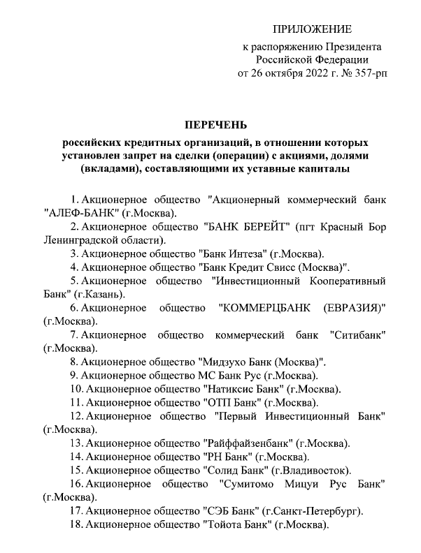 Распоряжением президента РФ недавно введен запрет на совершение сделок 45 банками.