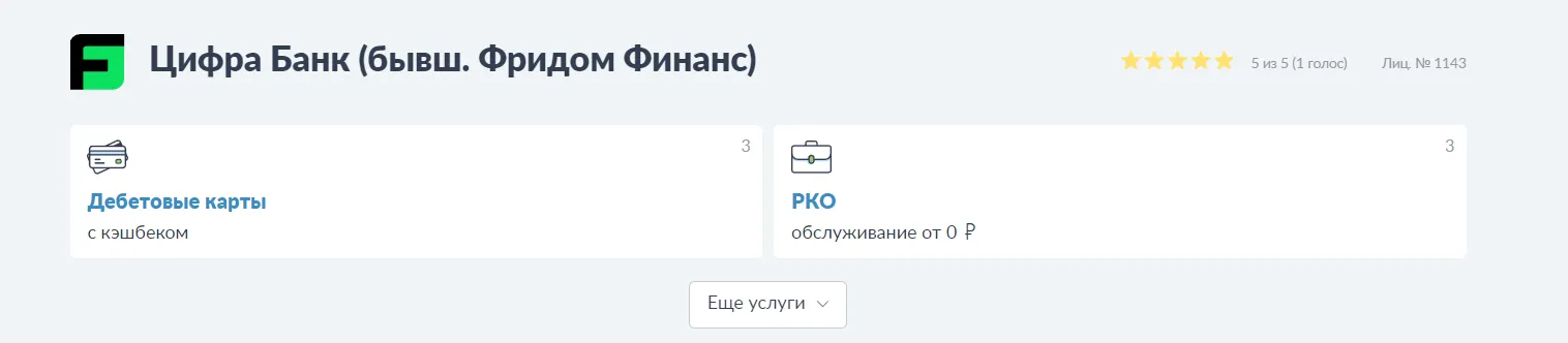 Совсем недавно свое название в целях ребрендинга сменил банк «Фридом Финанс». Теперь он будет называться «Цифра брокер», о чем банк уже уведомил своих клиентов и СМИ. Вот так, например, информация о банке выглядит на нашем сайте.