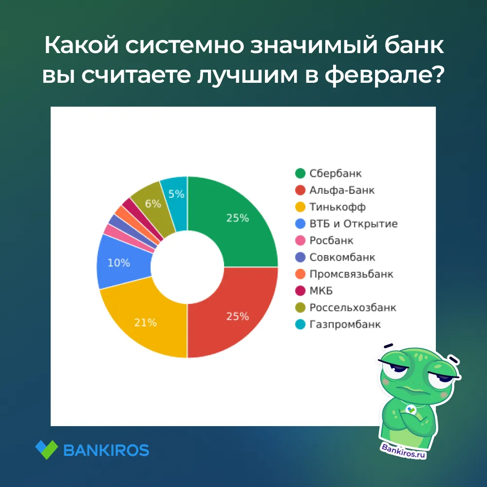 «Сбербанк» и «Альфа-Банк» стали лучшими банками февраля, согласно опросу Bankiros.ru. Также в числе лидеров «Тинькофф».