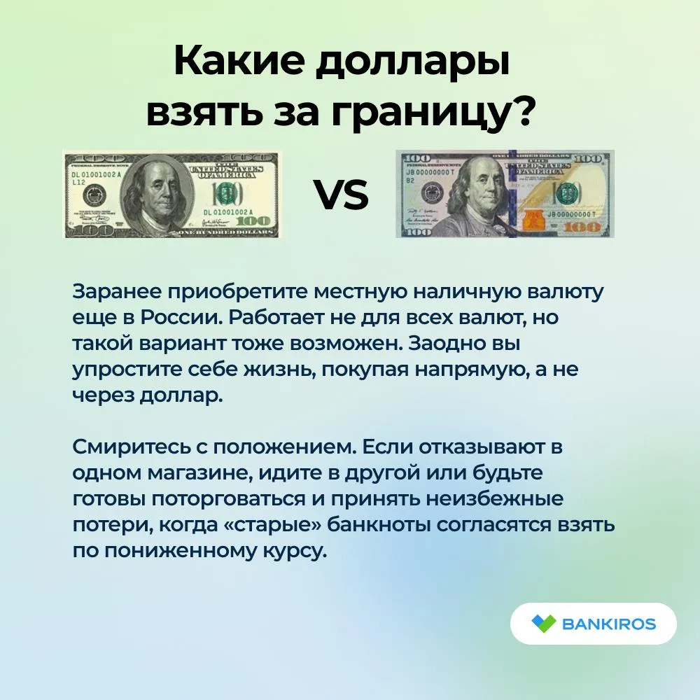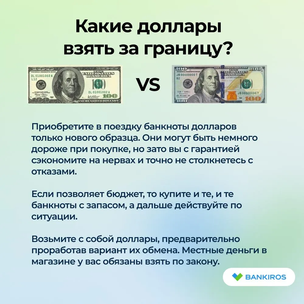 - Приобретите в поездку банкноты долларов только нового образца. Они могут быть немного дороже при покупке, но зато вы с гарантией сэкономите на нервах и точно не столкнетесь с отказами.